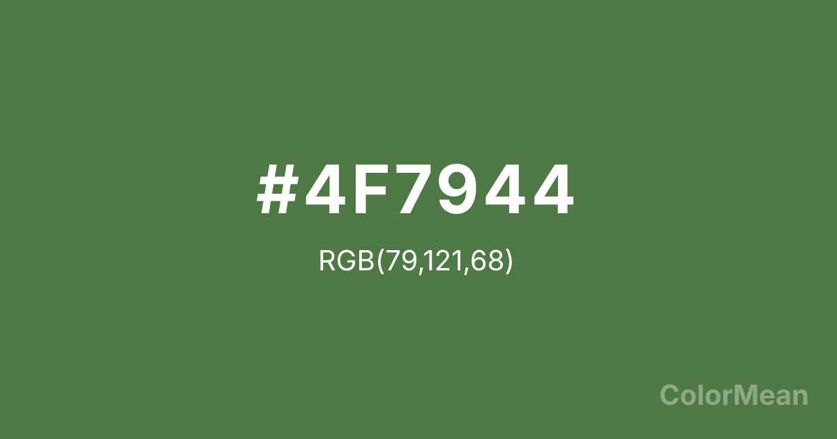 #4F7944 RGB value is (79, 121, 68). The hex color red value is 79, green is 121, and blue is 68. Its HSL format shows a hue of 108°, saturation of 28 percent, and lightness of 37 percent. The CMYK process values are 35 percent, 0 percent, 44 percent, 53 percent.