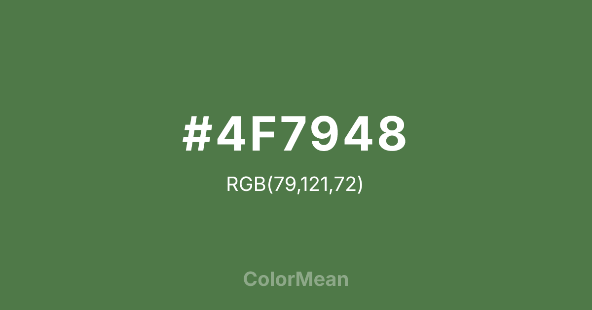 #4F7948 RGB value is (79, 121, 72). The hex color red value is 79, green is 121, and blue is 72. Its HSL format shows a hue of 111°, saturation of 25 percent, and lightness of 38 percent. The CMYK process values are 35 percent, 0 percent, 40 percent, 53 percent.