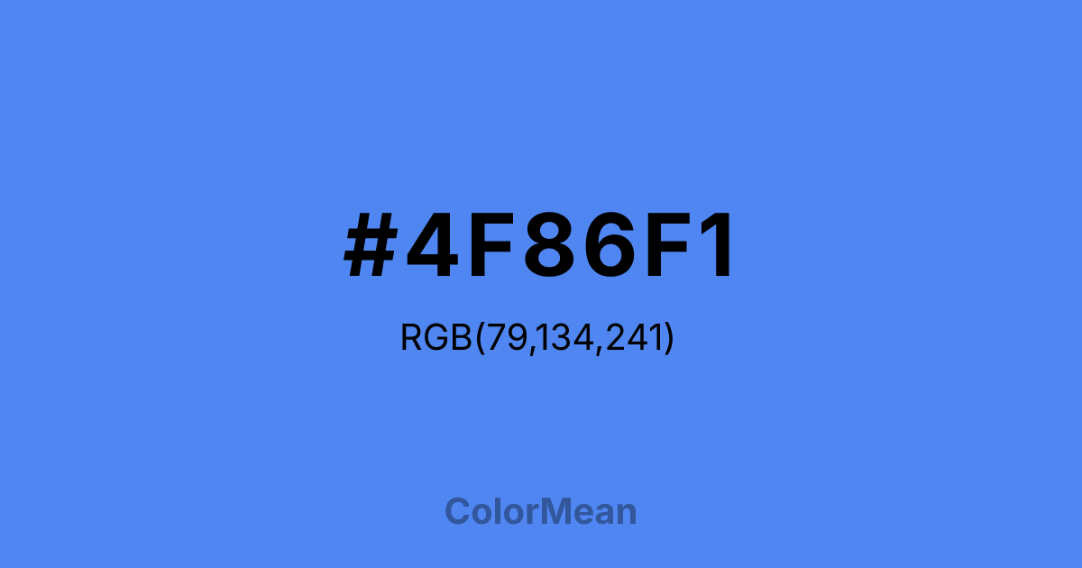 #4F86F1 RGB value is (79, 134, 241). The hex color red value is 79, green is 134, and blue is 241. Its HSL format shows a hue of 220°, saturation of 85 percent, and lightness of 63 percent. The CMYK process values are 67 percent, 44 percent, 0 percent, 5 percent.