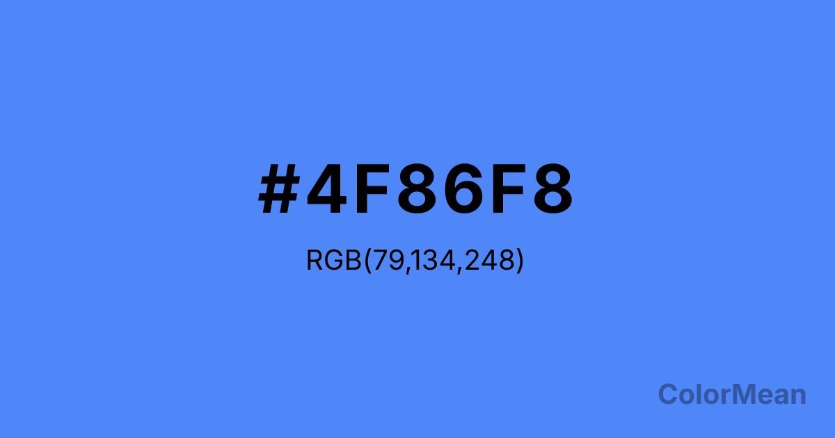 #4F86F8 RGB value is (79, 134, 248). The hex color red value is 79, green is 134, and blue is 248. Its HSL format shows a hue of 220°, saturation of 92 percent, and lightness of 64 percent. The CMYK process values are 68 percent, 46 percent, 0 percent, 3 percent.