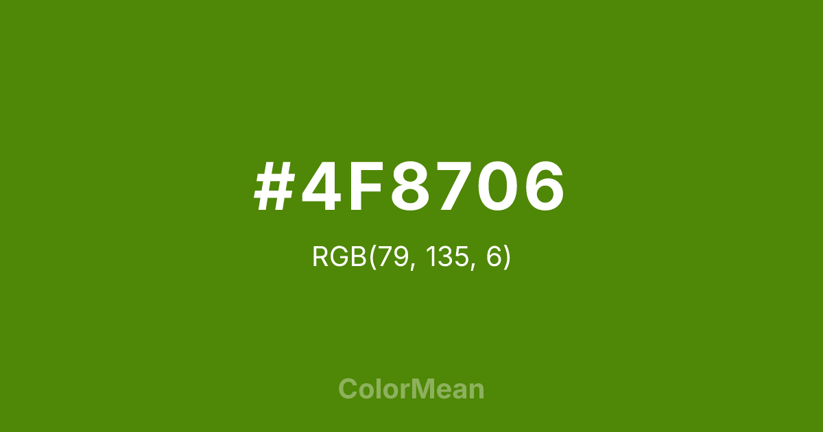 #4F8706 RGB value is (79, 135, 6). The hex color red value is 79, green is 135, and blue is 6. Its HSL format shows a hue of 86°, saturation of 91 percent, and lightness of 28 percent. The CMYK process values are 41 percent, 0 percent, 96 percent, 47 percent.