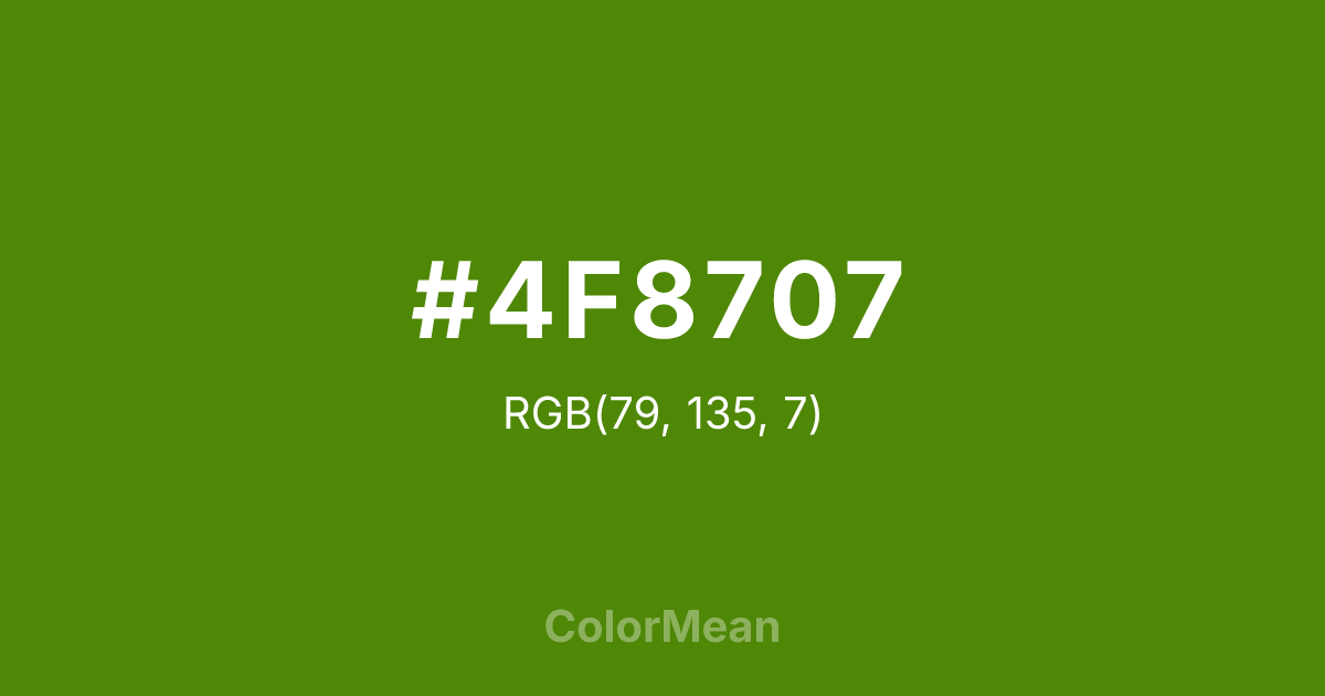 #4F8707 RGB value is (79, 135, 7). The hex color red value is 79, green is 135, and blue is 7. Its HSL format shows a hue of 86°, saturation of 90 percent, and lightness of 28 percent. The CMYK process values are 41 percent, 0 percent, 95 percent, 47 percent.