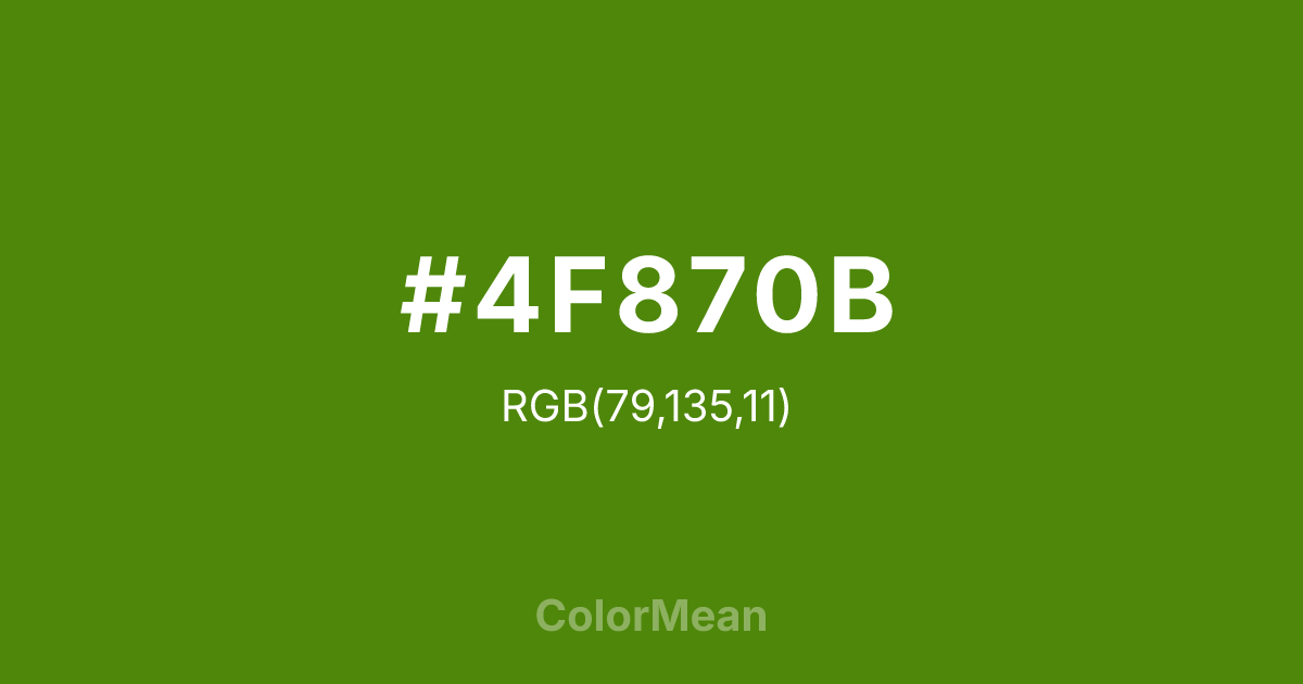 #4F870B RGB value is (79, 135, 11). The hex color red value is 79, green is 135, and blue is 11. Its HSL format shows a hue of 87°, saturation of 85 percent, and lightness of 29 percent. The CMYK process values are 41 percent, 0 percent, 92 percent, 47 percent.
