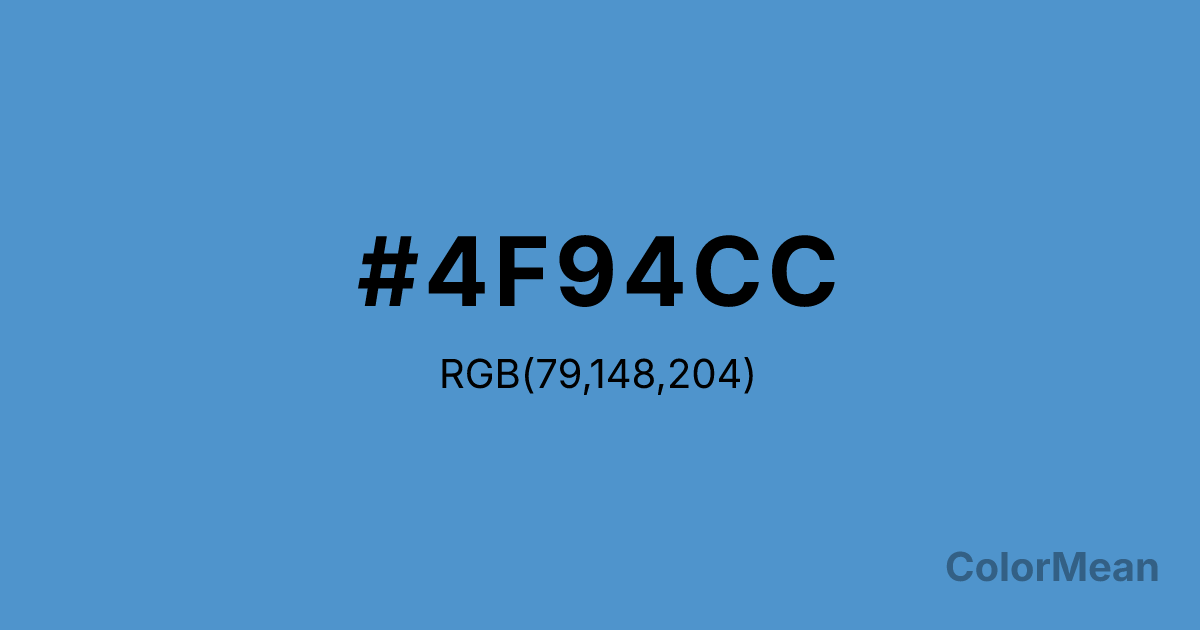 #4F94CC RGB value is (79, 148, 204). The hex color red value is 79, green is 148, and blue is 204. Its HSL format shows a hue of 207°, saturation of 55 percent, and lightness of 55 percent. The CMYK process values are 61 percent, 27 percent, 0 percent, 20 percent.