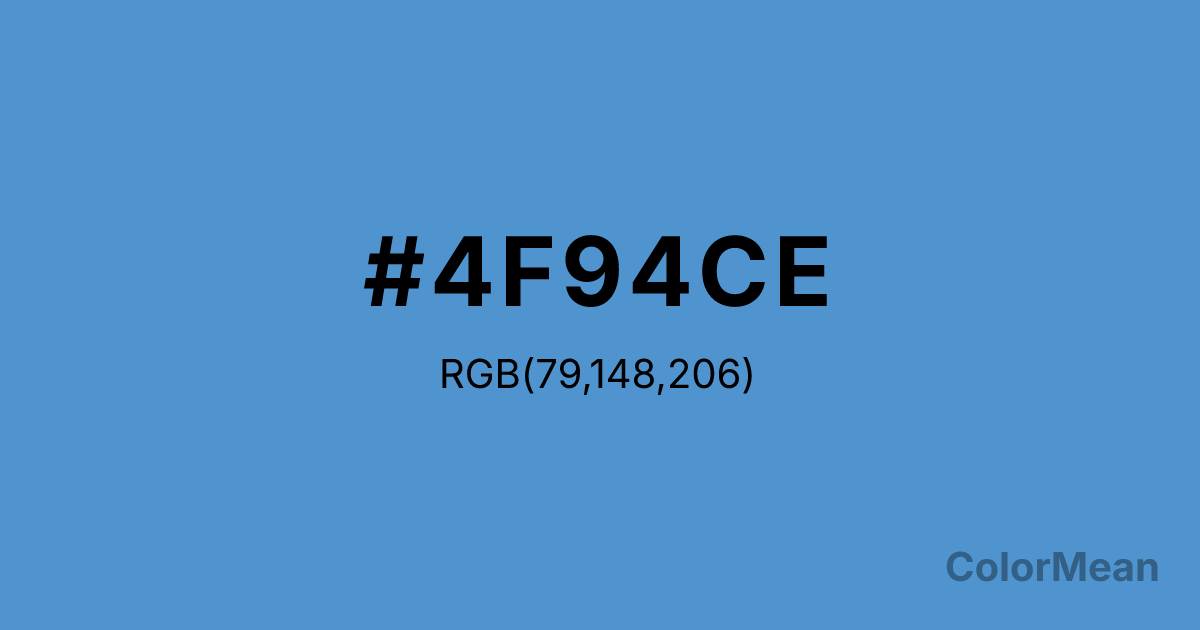 #4F94CE RGB value is (79, 148, 206). The hex color red value is 79, green is 148, and blue is 206. Its HSL format shows a hue of 207°, saturation of 56 percent, and lightness of 56 percent. The CMYK process values are 62 percent, 28 percent, 0 percent, 19 percent.