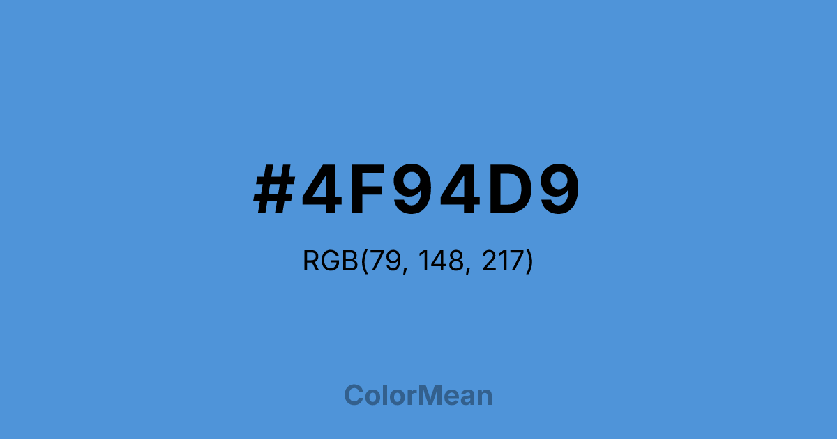 #4F94D9 RGB value is (79, 148, 217). The hex color red value is 79, green is 148, and blue is 217. Its HSL format shows a hue of 210°, saturation of 64 percent, and lightness of 58 percent. The CMYK process values are 64 percent, 32 percent, 0 percent, 15 percent.