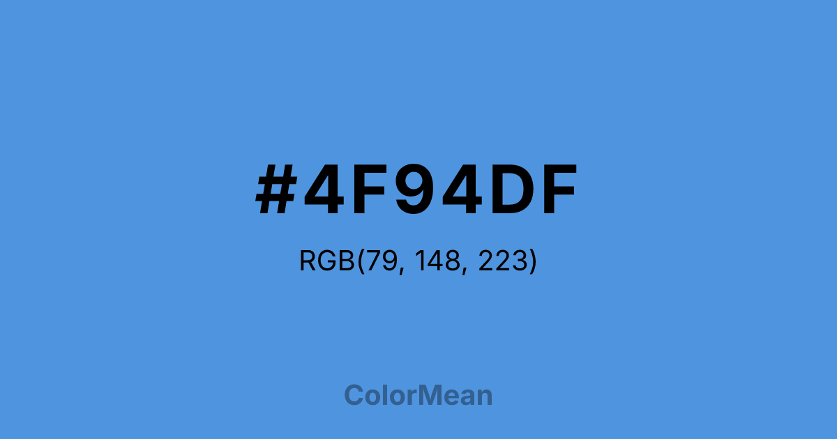 #4F94DF RGB value is (79, 148, 223). The hex color red value is 79, green is 148, and blue is 223. Its HSL format shows a hue of 211°, saturation of 69 percent, and lightness of 59 percent. The CMYK process values are 65 percent, 34 percent, 0 percent, 13 percent.