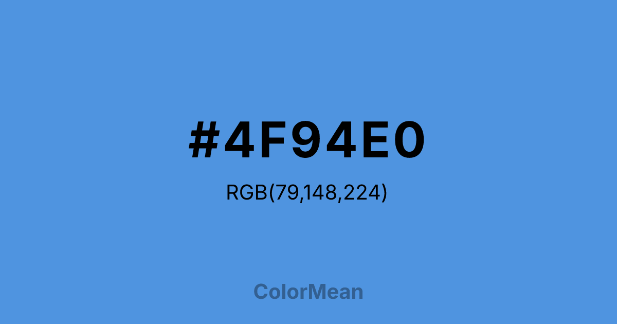 #4F94E0 RGB value is (79, 148, 224). The hex color red value is 79, green is 148, and blue is 224. Its HSL format shows a hue of 211°, saturation of 70 percent, and lightness of 59 percent. The CMYK process values are 65 percent, 34 percent, 0 percent, 12 percent.