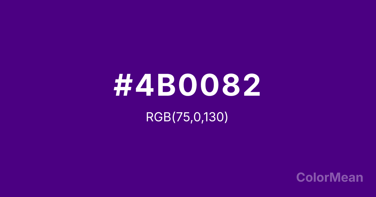 Indigo (#4B0082) RGB value is (75, 0, 130). The hex color red value is 75, green is 0, and blue is 130. Its HSL format shows a hue of 275°, saturation of 100 percent, and lightness of 25 percent. The CMYK process values are 42 percent, 100 percent, 0 percent, 49 percent.