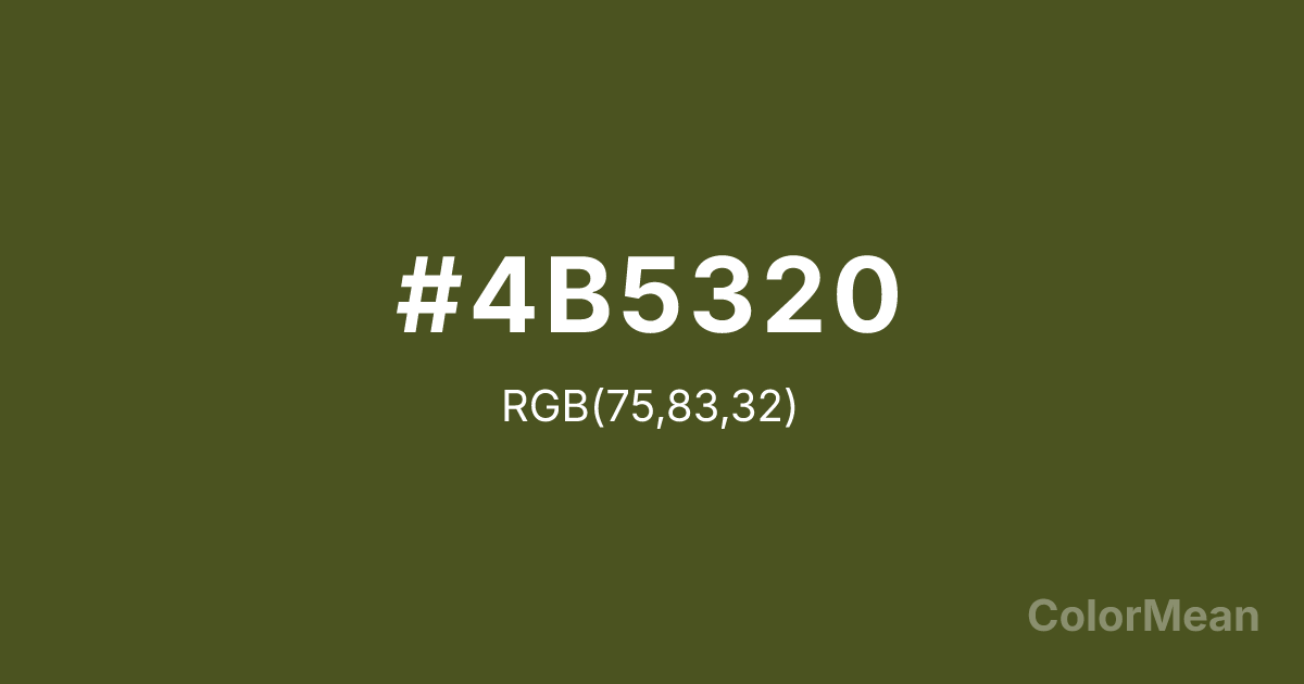 Army Green (#4B5320) RGB value is (75, 83, 32). The hex color red value is 75, green is 83, and blue is 32. Its HSL format shows a hue of 69°, saturation of 44 percent, and lightness of 23 percent. The CMYK process values are 10 percent, 0 percent, 61 percent, 67 percent.