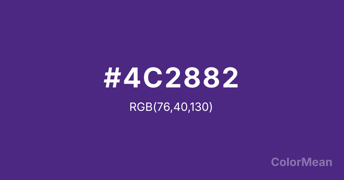 Spanish Violet (#4C2882) RGB value is (76, 40, 130). The hex color red value is 76, green is 40, and blue is 130. Its HSL format shows a hue of 264°, saturation of 53 percent, and lightness of 33 percent. The CMYK process values are 42 percent, 69 percent, 0 percent, 49 percent.