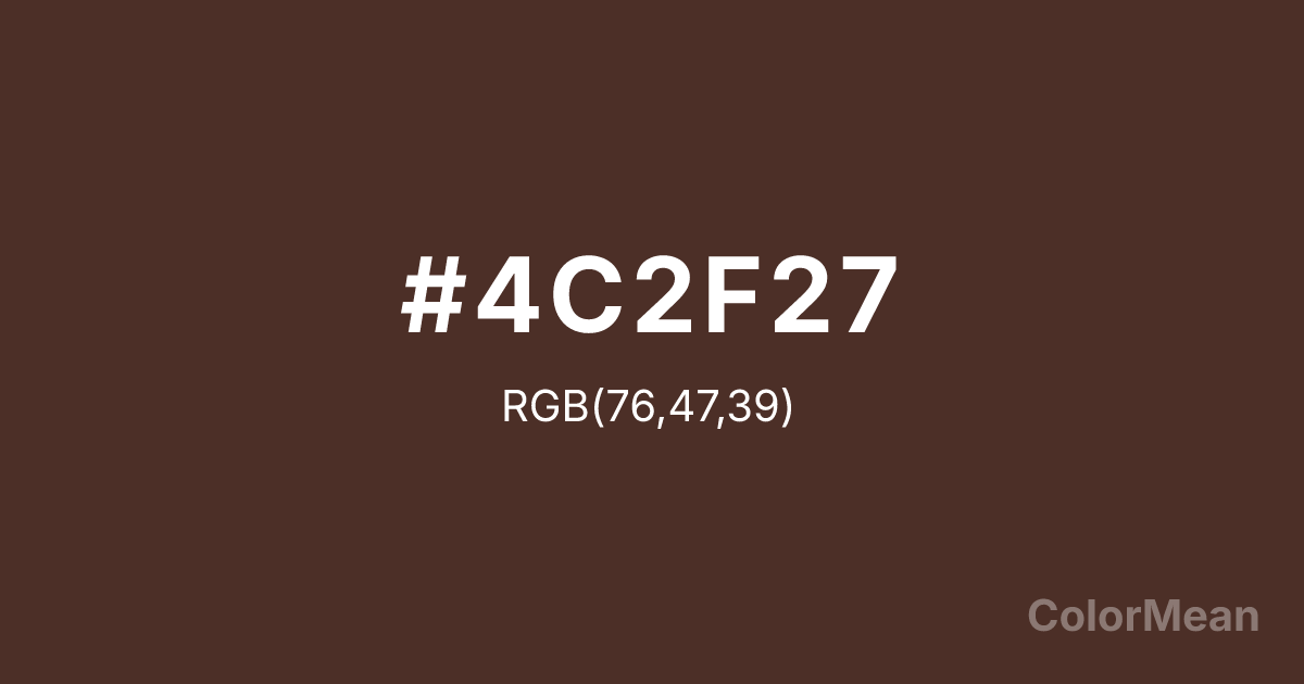 Mahogany Brown (#4C2F27) RGB value is (76, 47, 39). The hex color red value is 76, green is 47, and blue is 39. Its HSL format shows a hue of 13°, saturation of 32 percent, and lightness of 23 percent. The CMYK process values are 0 percent, 38 percent, 49 percent, 70 percent.
