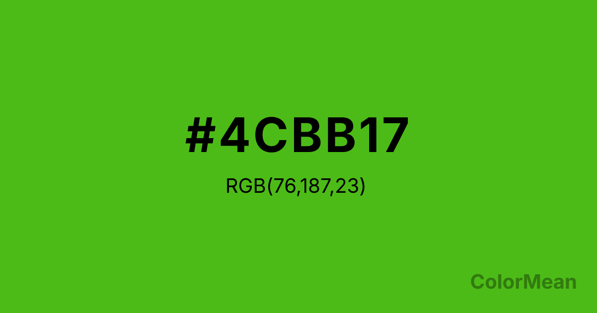 Kelly Green (#4CBB17) RGB value is (76, 187, 23). The hex color red value is 76, green is 187, and blue is 23. Its HSL format shows a hue of 101°, saturation of 78 percent, and lightness of 41 percent. The CMYK process values are 59 percent, 0 percent, 88 percent, 27 percent.