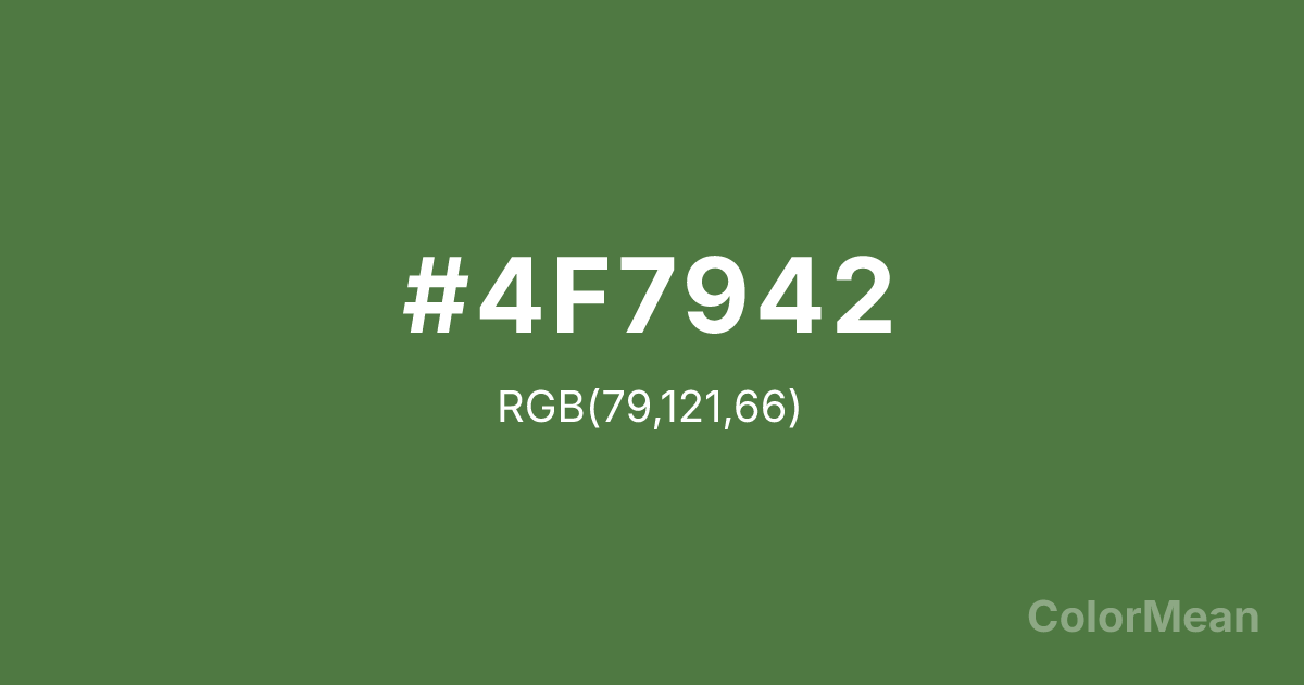 Fern Green (web) (#4F7942) RGB value is (79, 121, 66). The hex color red value is 79, green is 121, and blue is 66. Its HSL format shows a hue of 106°, saturation of 29 percent, and lightness of 37 percent. The CMYK process values are 35 percent, 0 percent, 45 percent, 53 percent.