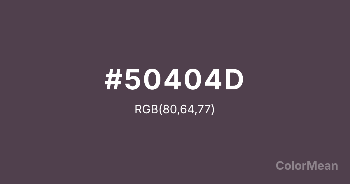 Purple Taupe (#50404D) RGB value is (80, 64, 77). The hex color red value is 80, green is 64, and blue is 77. Its HSL format shows a hue of 311°, saturation of 11 percent, and lightness of 28 percent. The CMYK process values are 0 percent, 20 percent, 4 percent, 69 percent.