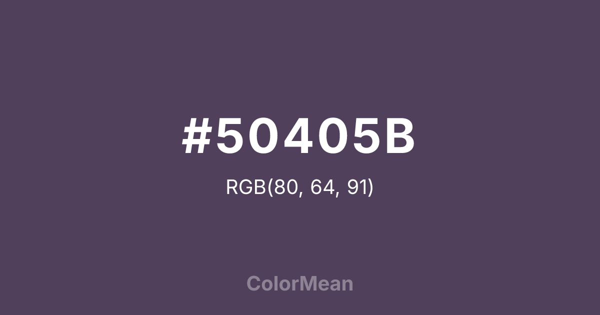 #50405B RGB value is (80, 64, 91). The hex color red value is 80, green is 64, and blue is 91. Its HSL format shows a hue of 276°, saturation of 17 percent, and lightness of 30 percent. The CMYK process values are 12 percent, 30 percent, 0 percent, 64 percent.