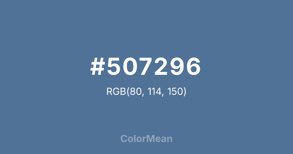 #507296 RGB value is (80, 114, 150). The hex color red value is 80, green is 114, and blue is 150. Its HSL format shows a hue of 211°, saturation of 30 percent, and lightness of 45 percent. The CMYK process values are 47 percent, 24 percent, 0 percent, 41 percent.