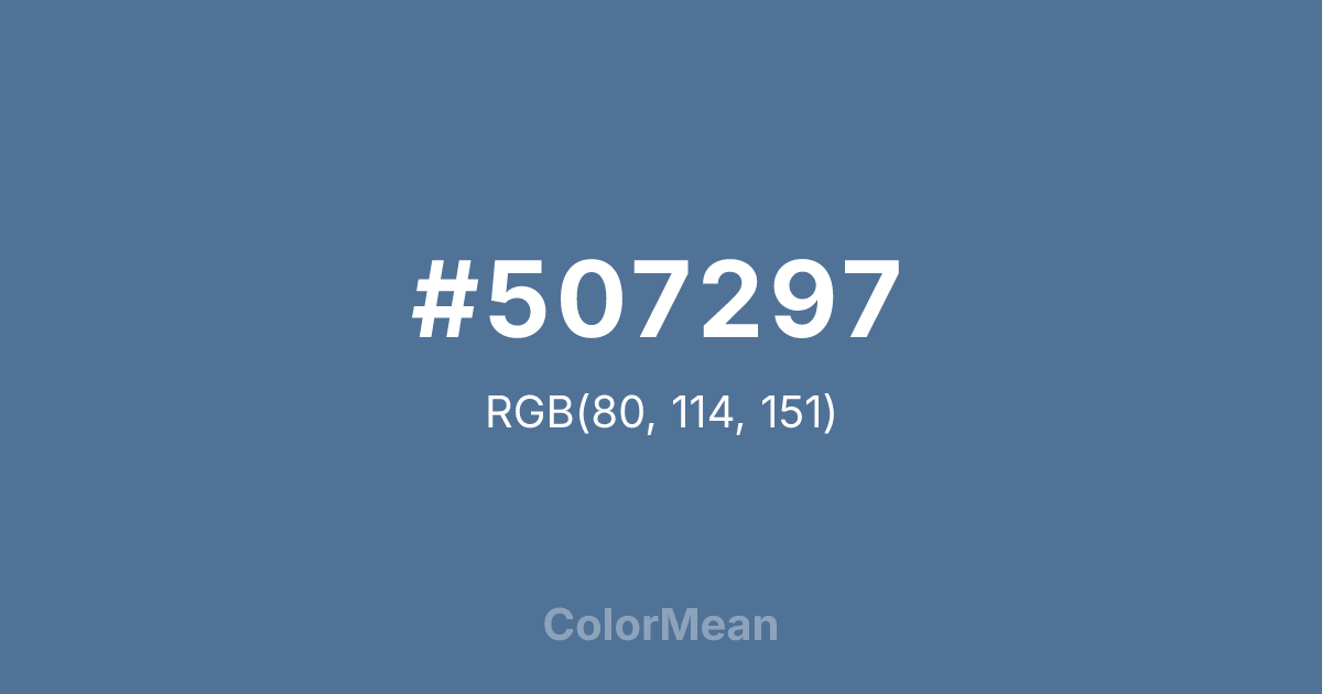 #507297 RGB value is (80, 114, 151). The hex color red value is 80, green is 114, and blue is 151. Its HSL format shows a hue of 211°, saturation of 31 percent, and lightness of 45 percent. The CMYK process values are 47 percent, 25 percent, 0 percent, 41 percent.