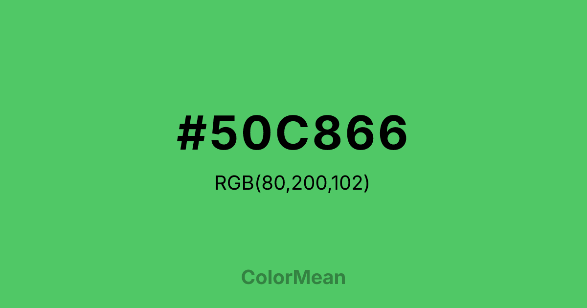 #50C866 RGB value is (80, 200, 102). The hex color red value is 80, green is 200, and blue is 102. Its HSL format shows a hue of 131°, saturation of 52 percent, and lightness of 55 percent. The CMYK process values are 60 percent, 0 percent, 49 percent, 22 percent.