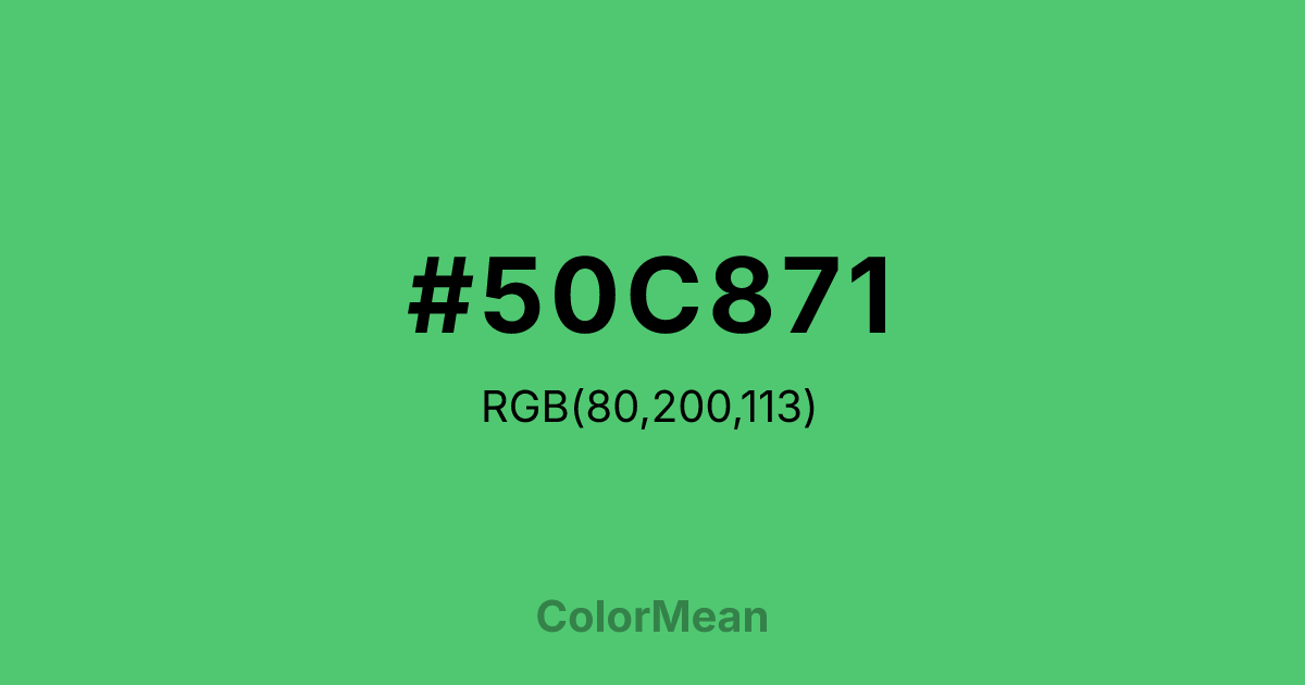 #50C871 RGB value is (80, 200, 113). The hex color red value is 80, green is 200, and blue is 113. Its HSL format shows a hue of 137°, saturation of 52 percent, and lightness of 55 percent. The CMYK process values are 60 percent, 0 percent, 44 percent, 22 percent.