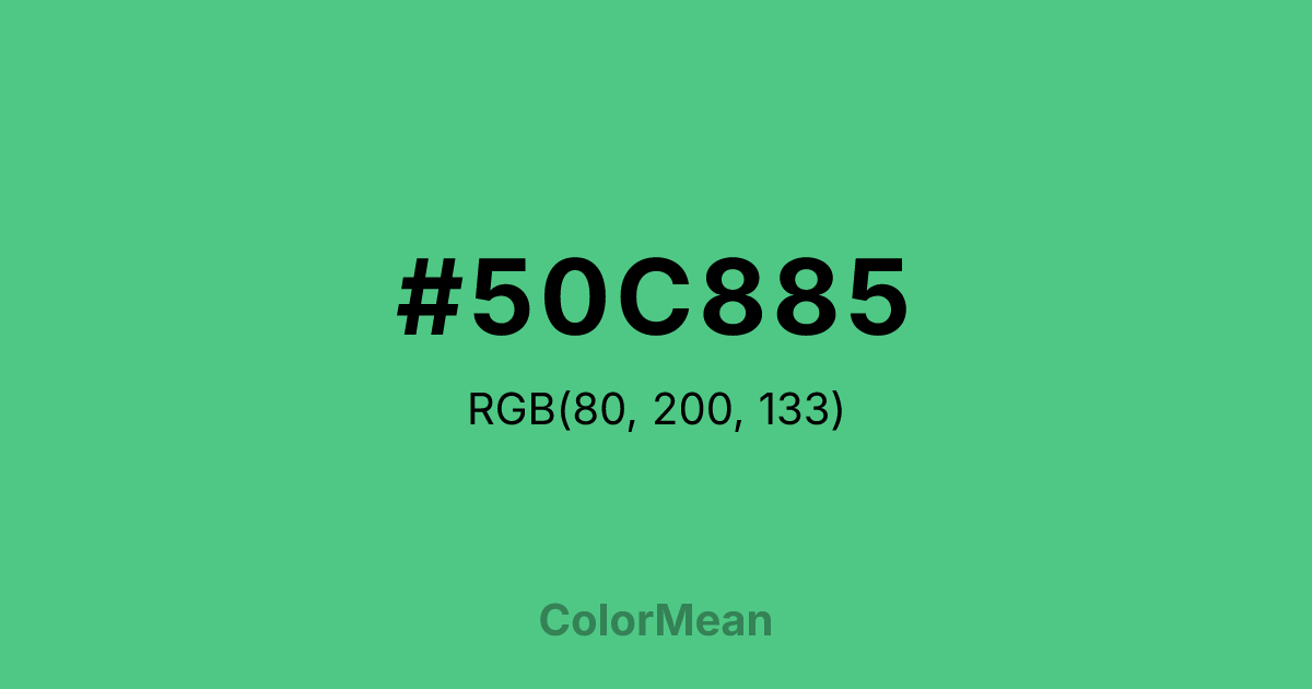#50C885 RGB value is (80, 200, 133). The hex color red value is 80, green is 200, and blue is 133. Its HSL format shows a hue of 147°, saturation of 52 percent, and lightness of 55 percent. The CMYK process values are 60 percent, 0 percent, 34 percent, 22 percent.