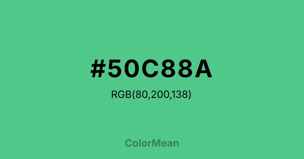 #50C88A RGB value is (80, 200, 138). The hex color red value is 80, green is 200, and blue is 138. Its HSL format shows a hue of 149°, saturation of 52 percent, and lightness of 55 percent. The CMYK process values are 60 percent, 0 percent, 31 percent, 22 percent.