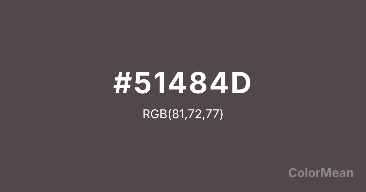 #51484D RGB value is (81, 72, 77). The hex color red value is 81, green is 72, and blue is 77. Its HSL format shows a hue of 327°, saturation of 6 percent, and lightness of 30 percent. The CMYK process values are 0 percent, 11 percent, 5 percent, 68 percent.
