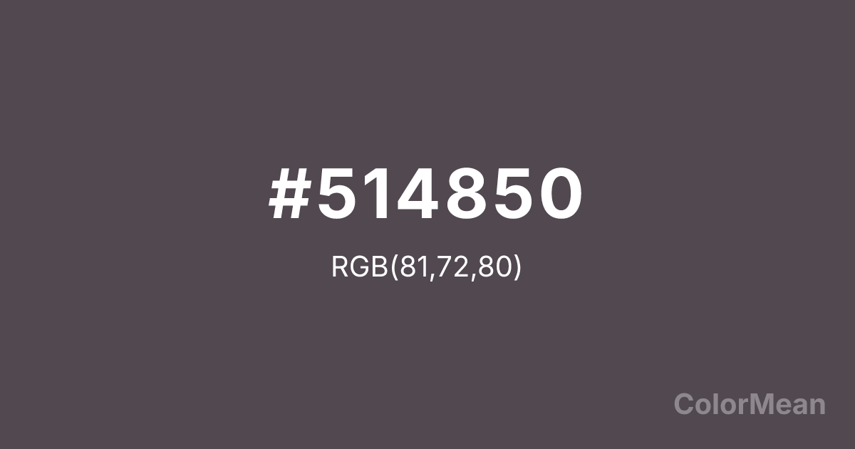 #514850 RGB value is (81, 72, 80). The hex color red value is 81, green is 72, and blue is 80. Its HSL format shows a hue of 307°, saturation of 6 percent, and lightness of 30 percent. The CMYK process values are 0 percent, 11 percent, 1 percent, 68 percent.
