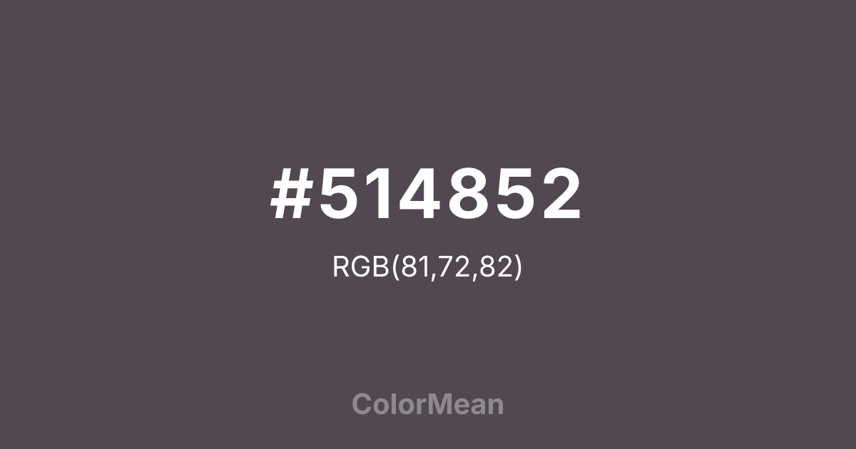 #514852 RGB value is (81, 72, 82). The hex color red value is 81, green is 72, and blue is 82. Its HSL format shows a hue of 294°, saturation of 6 percent, and lightness of 30 percent. The CMYK process values are 1 percent, 12 percent, 0 percent, 68 percent.