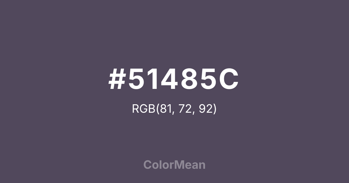 #51485C RGB value is (81, 72, 92). The hex color red value is 81, green is 72, and blue is 92. Its HSL format shows a hue of 267°, saturation of 12 percent, and lightness of 32 percent. The CMYK process values are 12 percent, 22 percent, 0 percent, 64 percent.