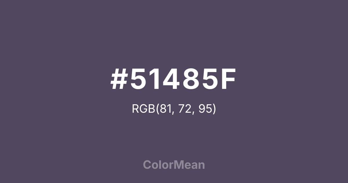 #51485F RGB value is (81, 72, 95). The hex color red value is 81, green is 72, and blue is 95. Its HSL format shows a hue of 263°, saturation of 14 percent, and lightness of 33 percent. The CMYK process values are 15 percent, 24 percent, 0 percent, 63 percent.