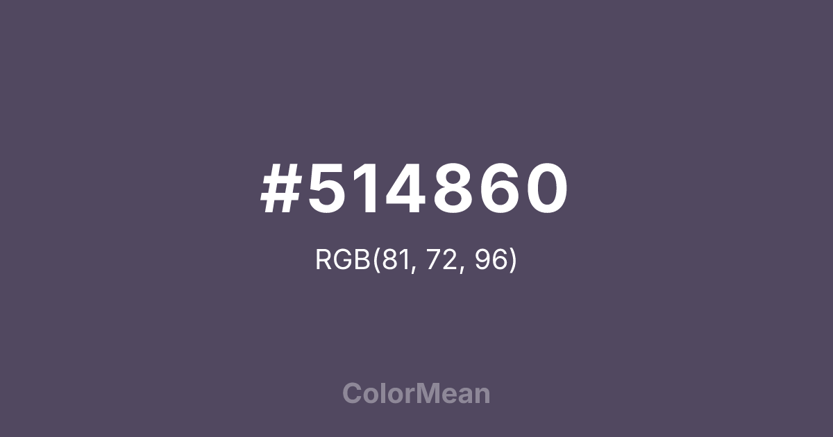 #514860 RGB value is (81, 72, 96). The hex color red value is 81, green is 72, and blue is 96. Its HSL format shows a hue of 263°, saturation of 14 percent, and lightness of 33 percent. The CMYK process values are 16 percent, 25 percent, 0 percent, 62 percent.