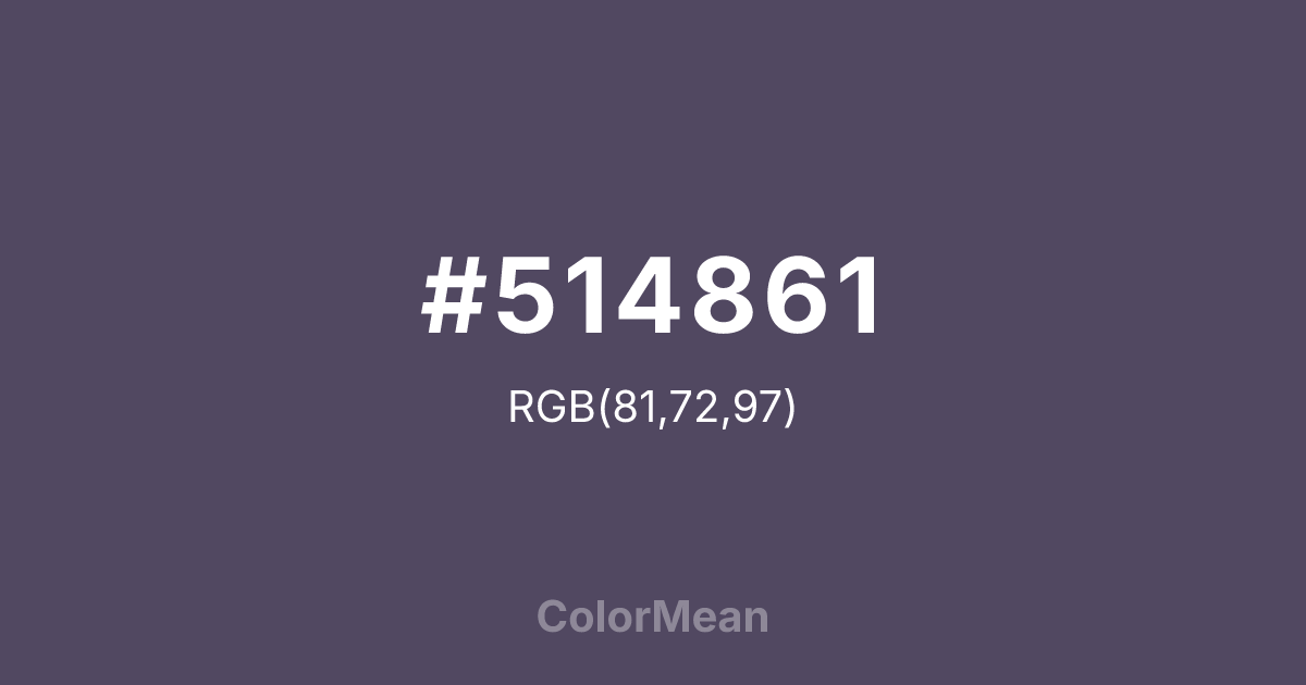#514861 RGB value is (81, 72, 97). The hex color red value is 81, green is 72, and blue is 97. Its HSL format shows a hue of 262°, saturation of 15 percent, and lightness of 33 percent. The CMYK process values are 16 percent, 26 percent, 0 percent, 62 percent.