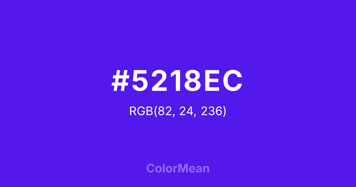 #5218EC RGB value is (82, 24, 236). The hex color red value is 82, green is 24, and blue is 236. Its HSL format shows a hue of 256°, saturation of 85 percent, and lightness of 51 percent. The CMYK process values are 65 percent, 90 percent, 0 percent, 7 percent.