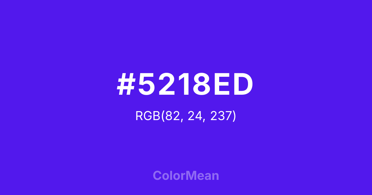 #5218ED RGB value is (82, 24, 237). The hex color red value is 82, green is 24, and blue is 237. Its HSL format shows a hue of 256°, saturation of 86 percent, and lightness of 51 percent. The CMYK process values are 65 percent, 90 percent, 0 percent, 7 percent.