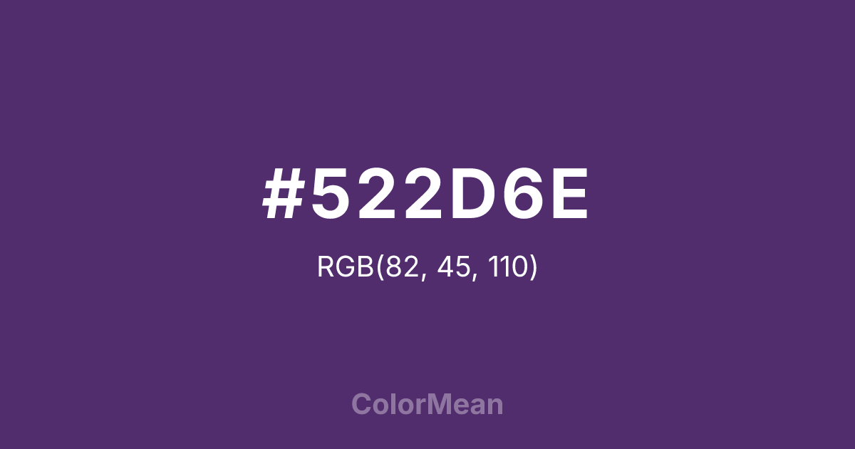 #522D6E RGB value is (82, 45, 110). The hex color red value is 82, green is 45, and blue is 110. Its HSL format shows a hue of 274°, saturation of 42 percent, and lightness of 30 percent. The CMYK process values are 25 percent, 59 percent, 0 percent, 57 percent.