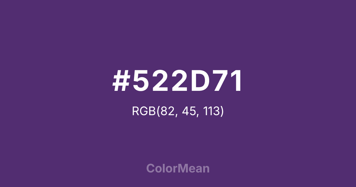 #522D71 RGB value is (82, 45, 113). The hex color red value is 82, green is 45, and blue is 113. Its HSL format shows a hue of 273°, saturation of 43 percent, and lightness of 31 percent. The CMYK process values are 27 percent, 60 percent, 0 percent, 56 percent.