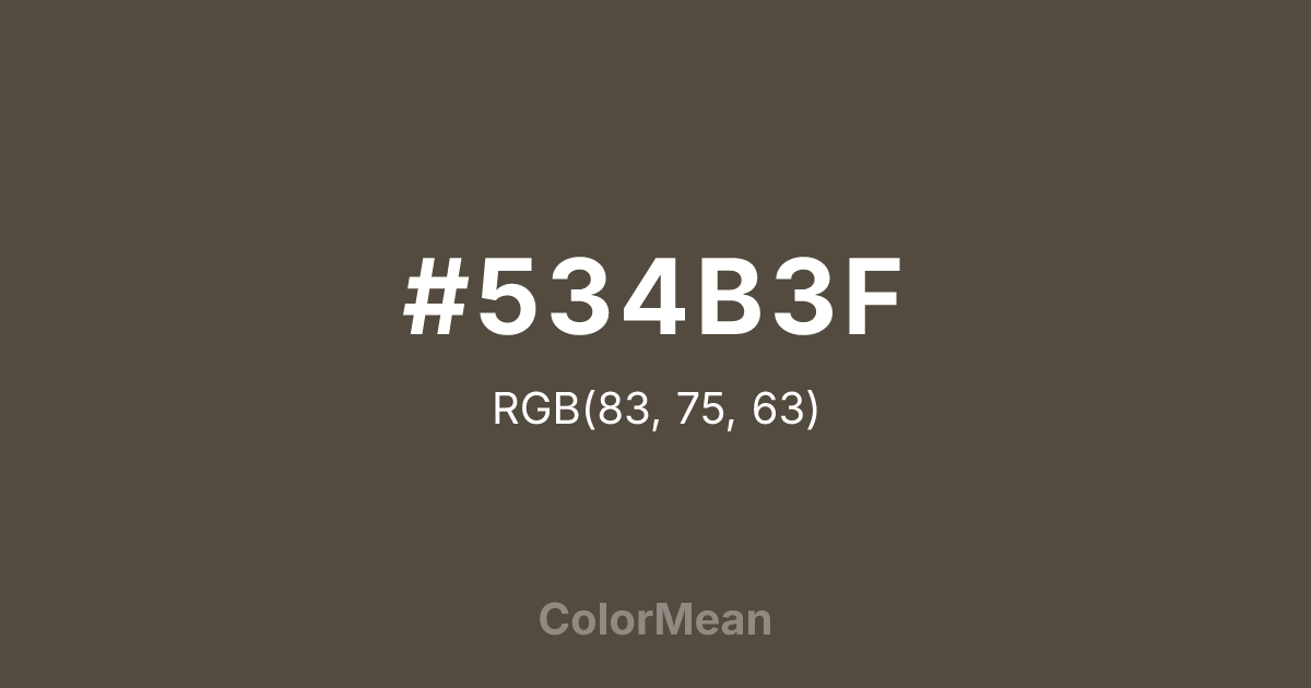 #534B3F RGB value is (83, 75, 63). The hex color red value is 83, green is 75, and blue is 63. Its HSL format shows a hue of 36°, saturation of 14 percent, and lightness of 29 percent. The CMYK process values are 0 percent, 10 percent, 24 percent, 67 percent.