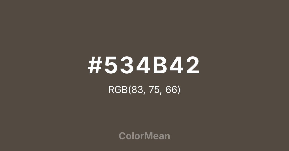 #534B42 RGB value is (83, 75, 66). The hex color red value is 83, green is 75, and blue is 66. Its HSL format shows a hue of 32°, saturation of 11 percent, and lightness of 29 percent. The CMYK process values are 0 percent, 10 percent, 20 percent, 67 percent.
