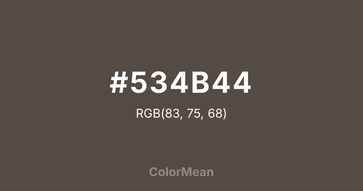 #534B44 RGB value is (83, 75, 68). The hex color red value is 83, green is 75, and blue is 68. Its HSL format shows a hue of 28°, saturation of 10 percent, and lightness of 30 percent. The CMYK process values are 0 percent, 10 percent, 18 percent, 67 percent.