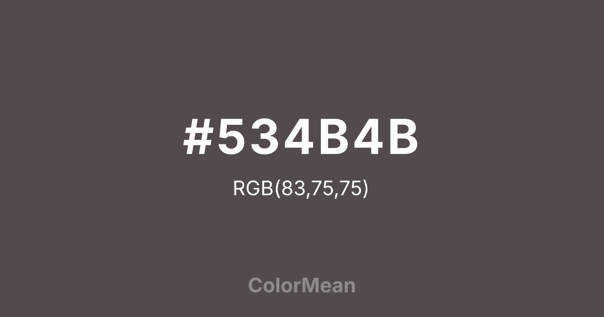 #534B4B RGB value is (83, 75, 75). The hex color red value is 83, green is 75, and blue is 75. Its HSL format shows a hue of 0°, saturation of 5 percent, and lightness of 31 percent. The CMYK process values are 0 percent, 10 percent, 10 percent, 67 percent.