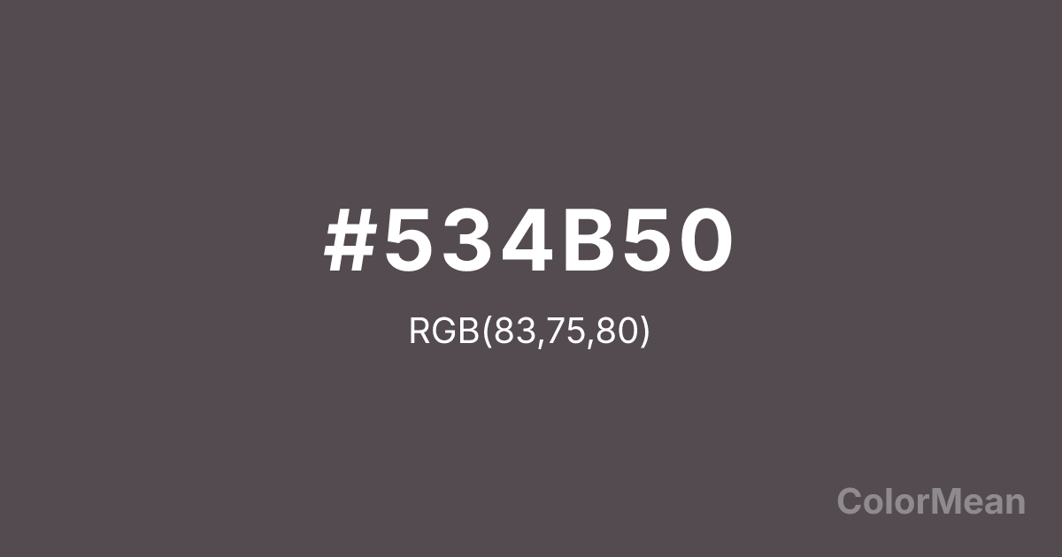 #534B50 RGB value is (83, 75, 80). The hex color red value is 83, green is 75, and blue is 80. Its HSL format shows a hue of 323°, saturation of 5 percent, and lightness of 31 percent. The CMYK process values are 0 percent, 10 percent, 4 percent, 67 percent.