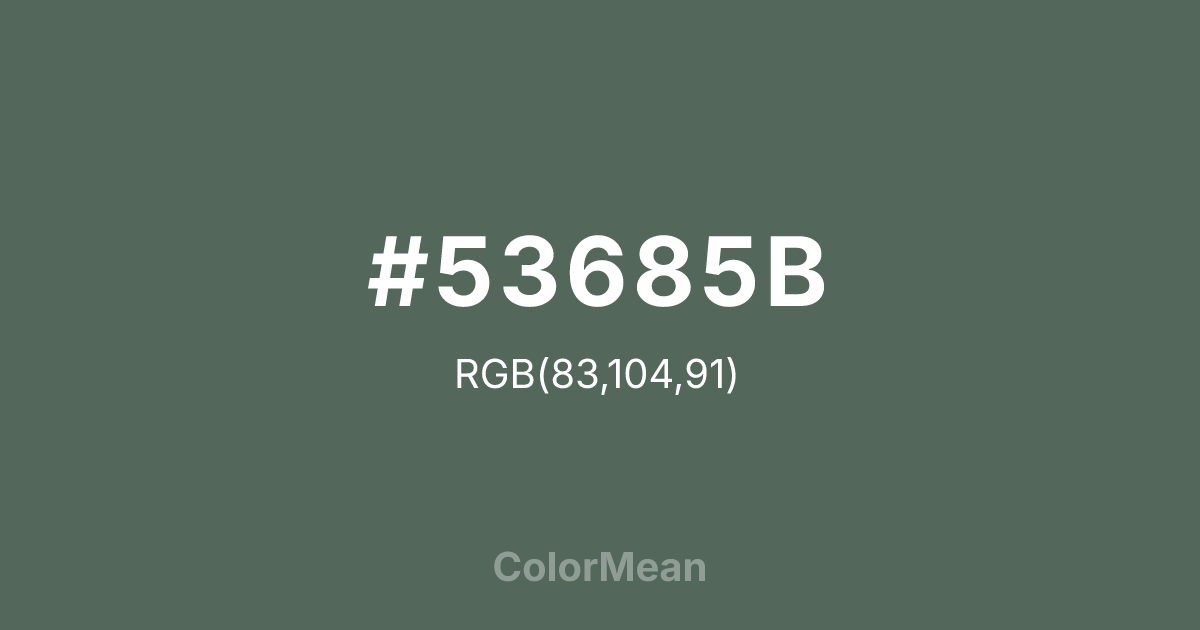 #53685B RGB value is (83, 104, 91). The hex color red value is 83, green is 104, and blue is 91. Its HSL format shows a hue of 143°, saturation of 11 percent, and lightness of 37 percent. The CMYK process values are 20 percent, 0 percent, 12 percent, 59 percent.