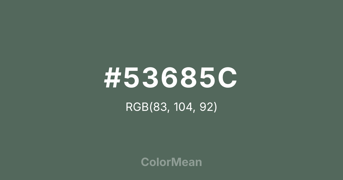 #53685C RGB value is (83, 104, 92). The hex color red value is 83, green is 104, and blue is 92. Its HSL format shows a hue of 146°, saturation of 11 percent, and lightness of 37 percent. The CMYK process values are 20 percent, 0 percent, 12 percent, 59 percent.