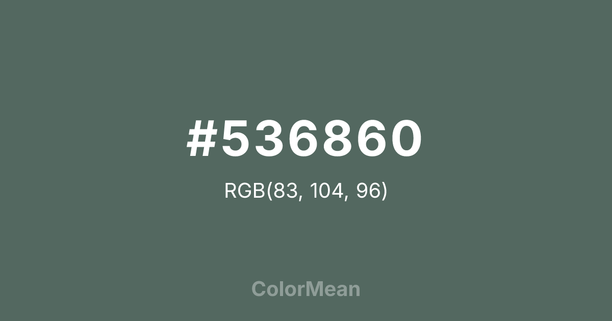 #536860 RGB value is (83, 104, 96). The hex color red value is 83, green is 104, and blue is 96. Its HSL format shows a hue of 157°, saturation of 11 percent, and lightness of 37 percent. The CMYK process values are 20 percent, 0 percent, 8 percent, 59 percent.