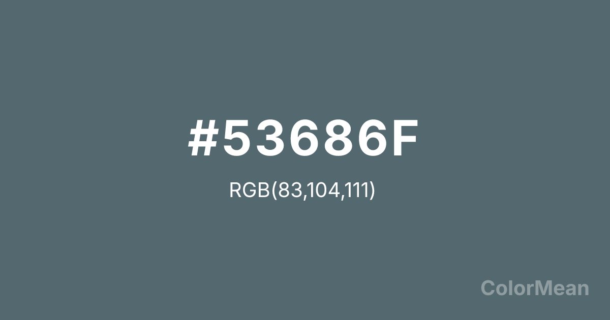 #53686F RGB value is (83, 104, 111). The hex color red value is 83, green is 104, and blue is 111. Its HSL format shows a hue of 195°, saturation of 14 percent, and lightness of 38 percent. The CMYK process values are 25 percent, 6 percent, 0 percent, 56 percent.