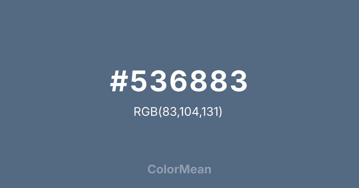 #536883 RGB value is (83, 104, 131). The hex color red value is 83, green is 104, and blue is 131. Its HSL format shows a hue of 214°, saturation of 22 percent, and lightness of 42 percent. The CMYK process values are 37 percent, 21 percent, 0 percent, 49 percent.