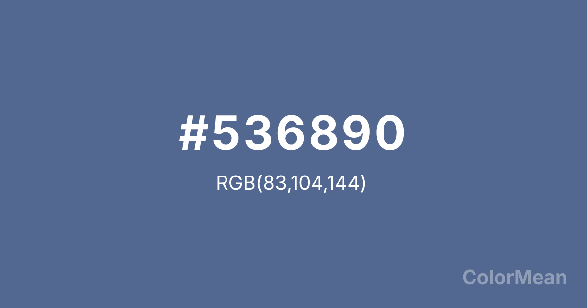 #536890 RGB value is (83, 104, 144). The hex color red value is 83, green is 104, and blue is 144. Its HSL format shows a hue of 219°, saturation of 27 percent, and lightness of 45 percent. The CMYK process values are 42 percent, 28 percent, 0 percent, 44 percent.