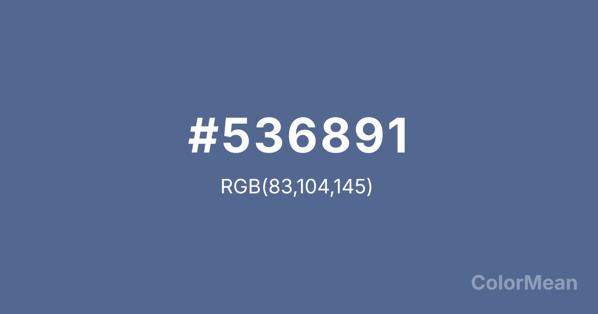#536891 RGB value is (83, 104, 145). The hex color red value is 83, green is 104, and blue is 145. Its HSL format shows a hue of 220°, saturation of 27 percent, and lightness of 45 percent. The CMYK process values are 43 percent, 28 percent, 0 percent, 43 percent.