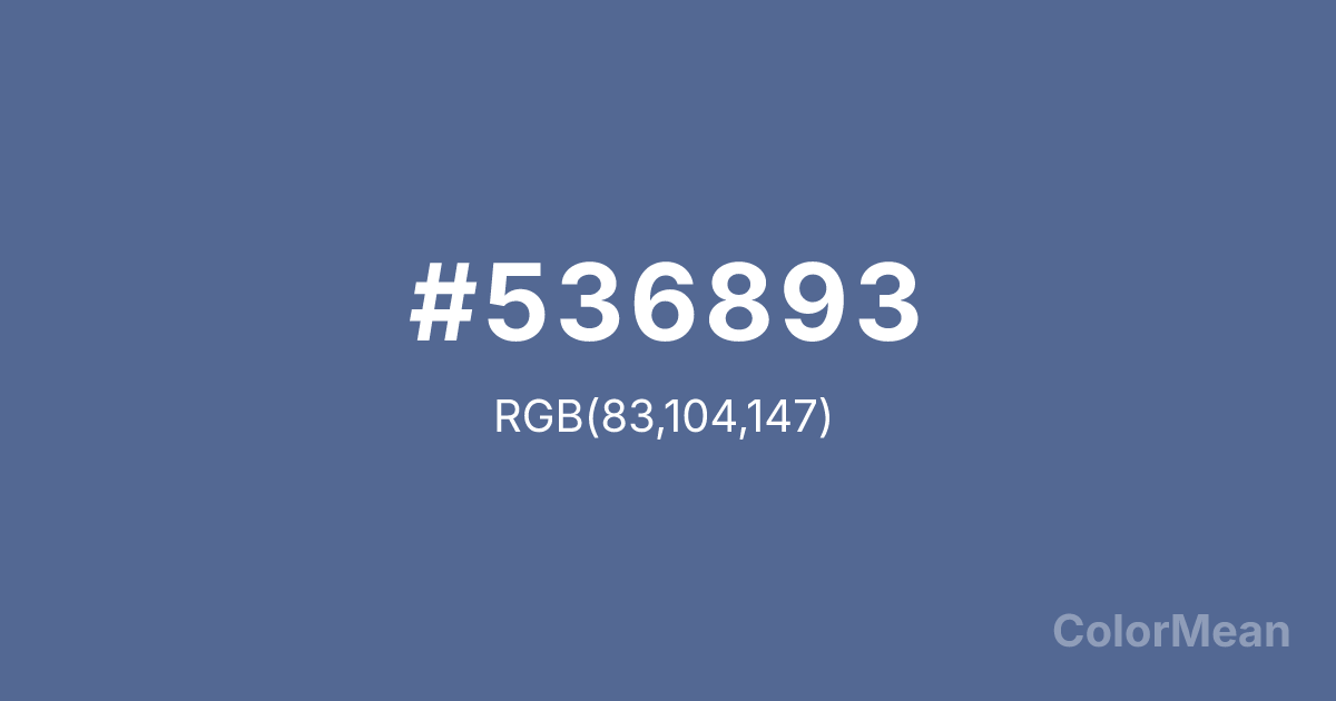 #536893 RGB value is (83, 104, 147). The hex color red value is 83, green is 104, and blue is 147. Its HSL format shows a hue of 220°, saturation of 28 percent, and lightness of 45 percent. The CMYK process values are 44 percent, 29 percent, 0 percent, 42 percent.